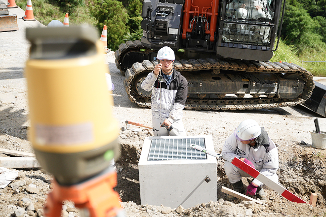 大型免許や重機の免許だけでなく普通免許など、仕事で必要な免許・資格取得の費用や、学習できる環境を会社全体向上のサポートを受け、いまでは現場で指示を出す場面も増えています。スマホ、iPadを使った測量や図面管理などなじみのあるツールを使いこなす場面も多いですが、現場で働いて感じるのは、コミュニケーションの重要性。