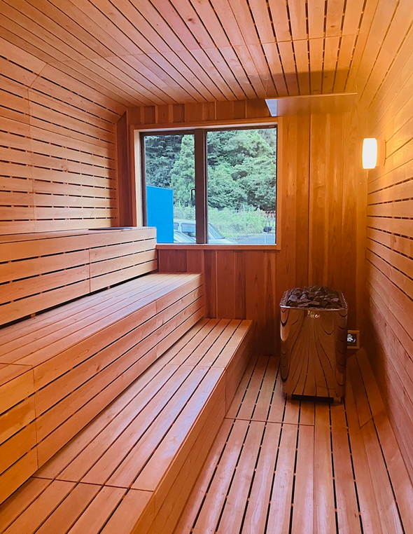 津久見市には日帰りのサウナ施設がないのが現状です。そこで私たちは「福利厚生施設」として、社宅敷地内にサウナを設置しました。